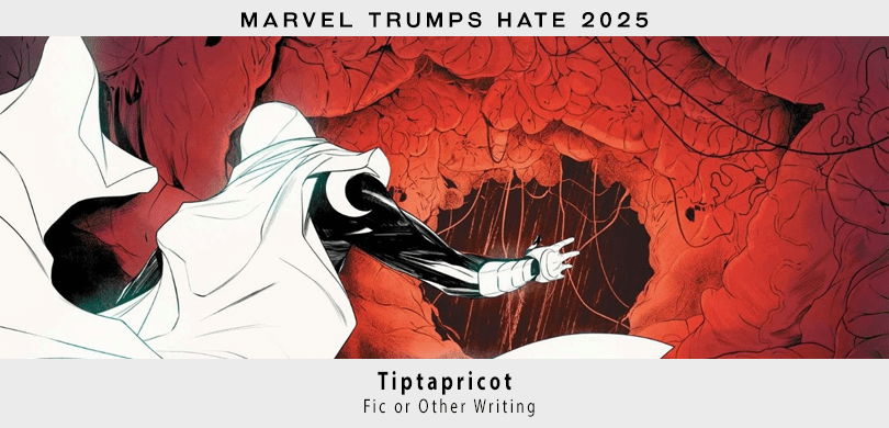 I am mostly interested in writing for the mainline comics versions of the Moon Knight cast, specifically in the continuity and characterization of the current Jed MacKay run. However, I am familiar with and have a history writing for the MCU versions of the characters, and can include some elements of that continuity if desired. I am not interested in writing fully MCU focused work, so if you have a story idea involving the MCU depictions you would like to get, please contact me via my listed Tumblr account or email beforehand to see if it's something I feel I can write.