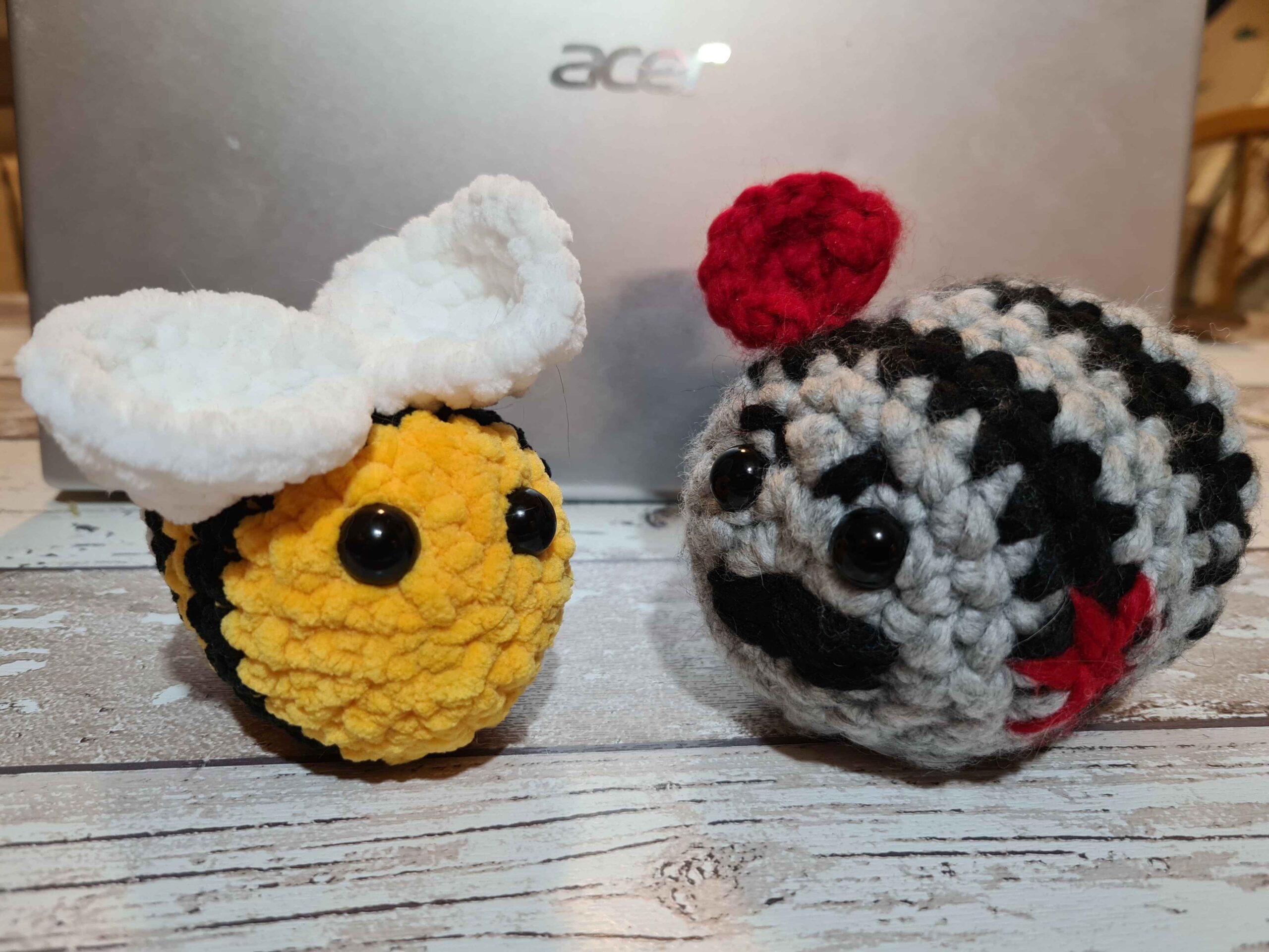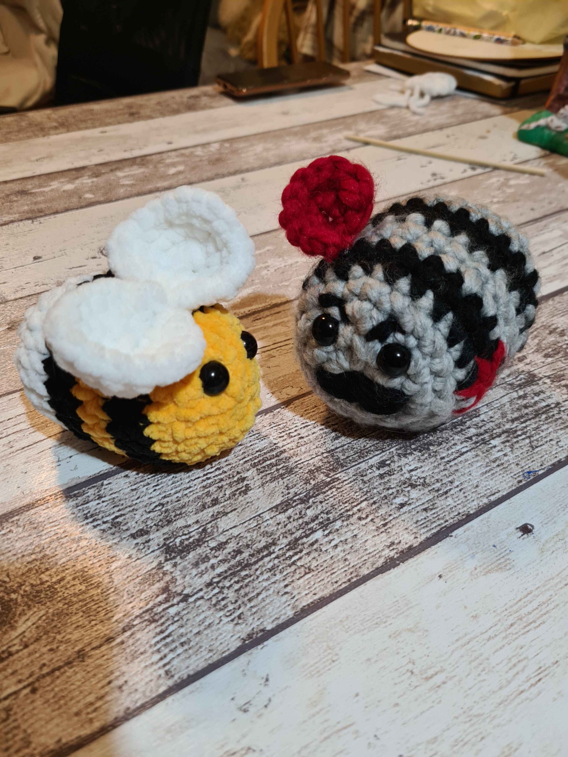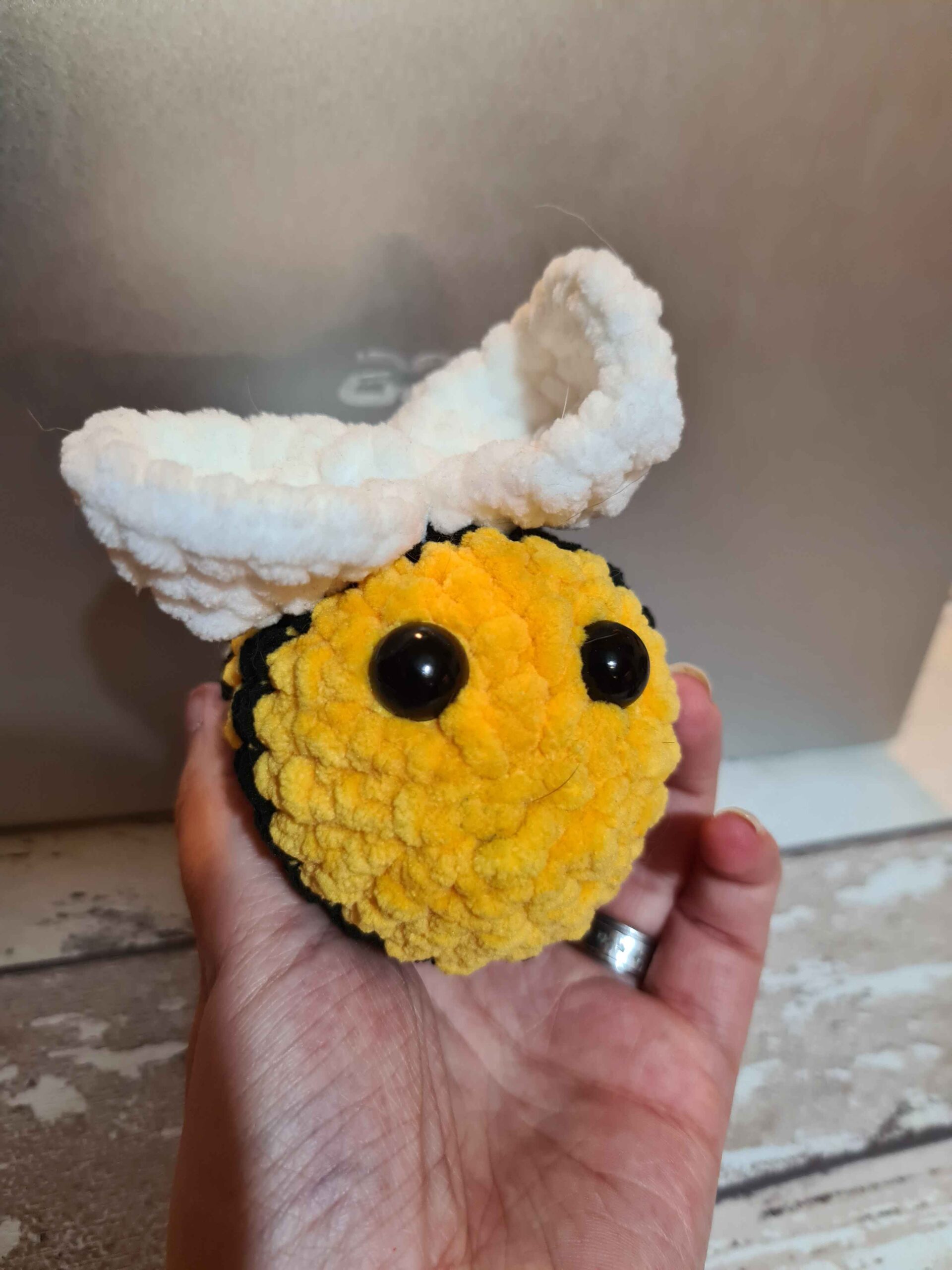 The bees are roughly palm-fitting size, but I can make them slightly bigger if you wish. I try to use soft and fluffy yarn for them, but depending on the color they might not be available here! (This also means that for the fluffy yarn there'll be slight shedding at the beginning.)