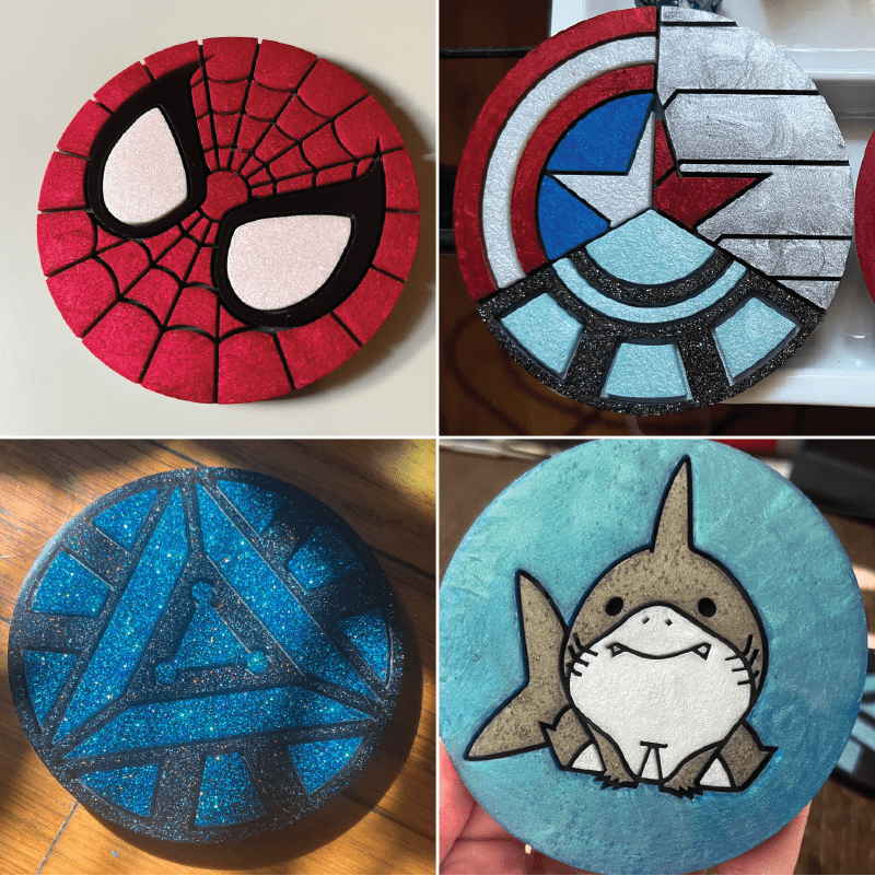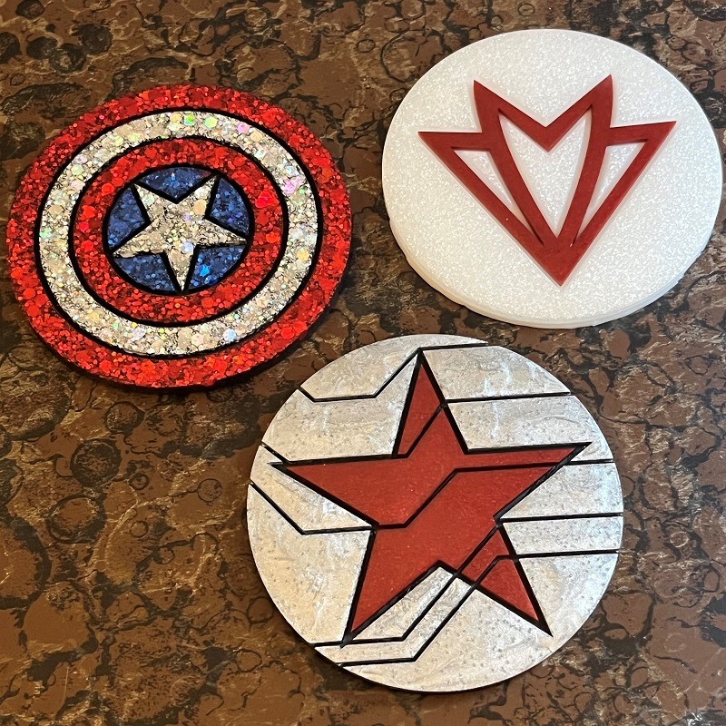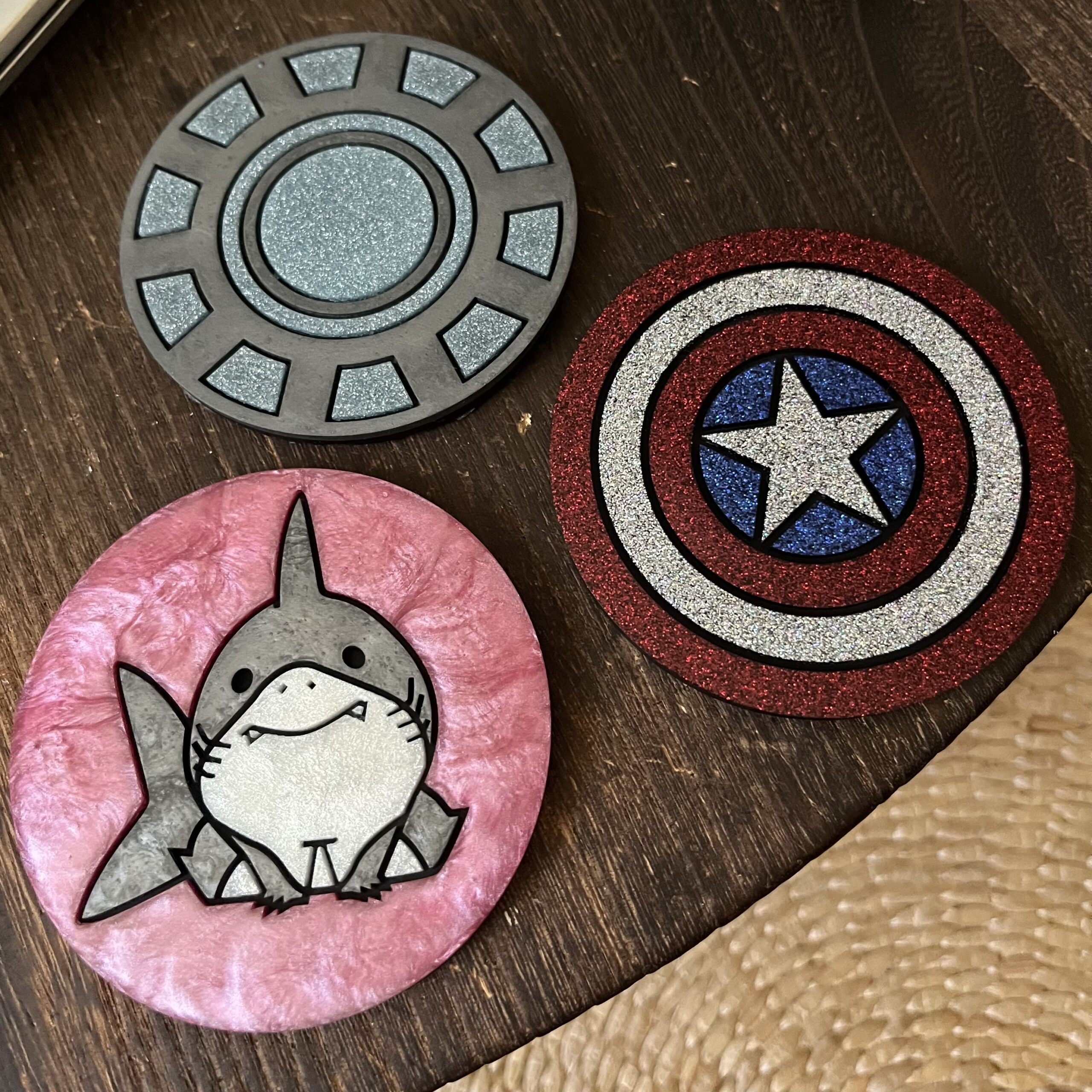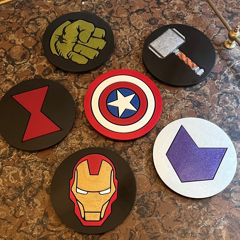 - I am offering a customized set of 6 epoxy resin coasters featuring symbols of Marvel characters. The coasters are 3.5 inches across and are backed with cork to prevent them from slipping or scratching. You get to choose the color scheme and the character symbols from this list below. If you want the original 6 Avengers in holographic glitter, I can do that – if you want six Iron Man helmets in a rainbow of colors, I can do that too!