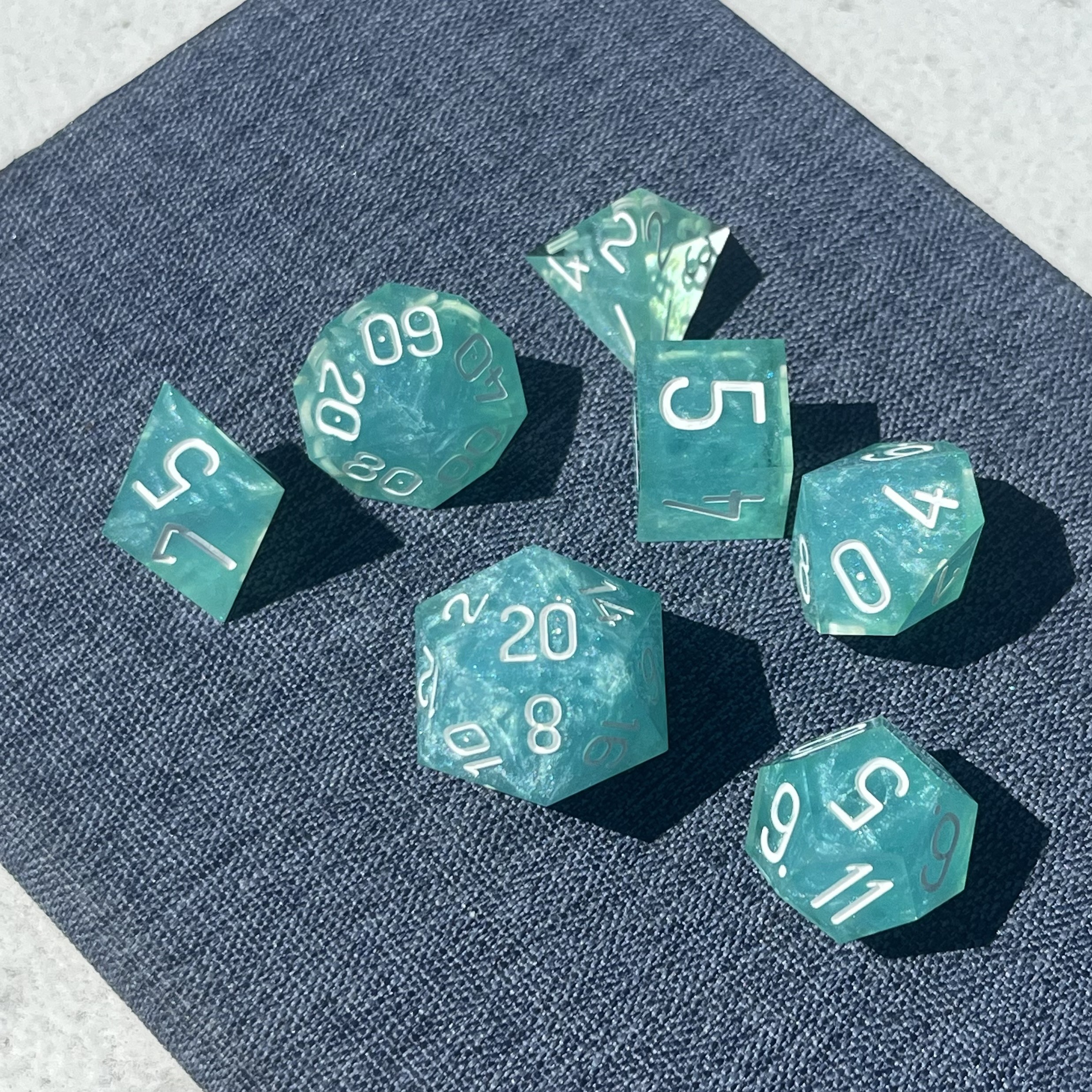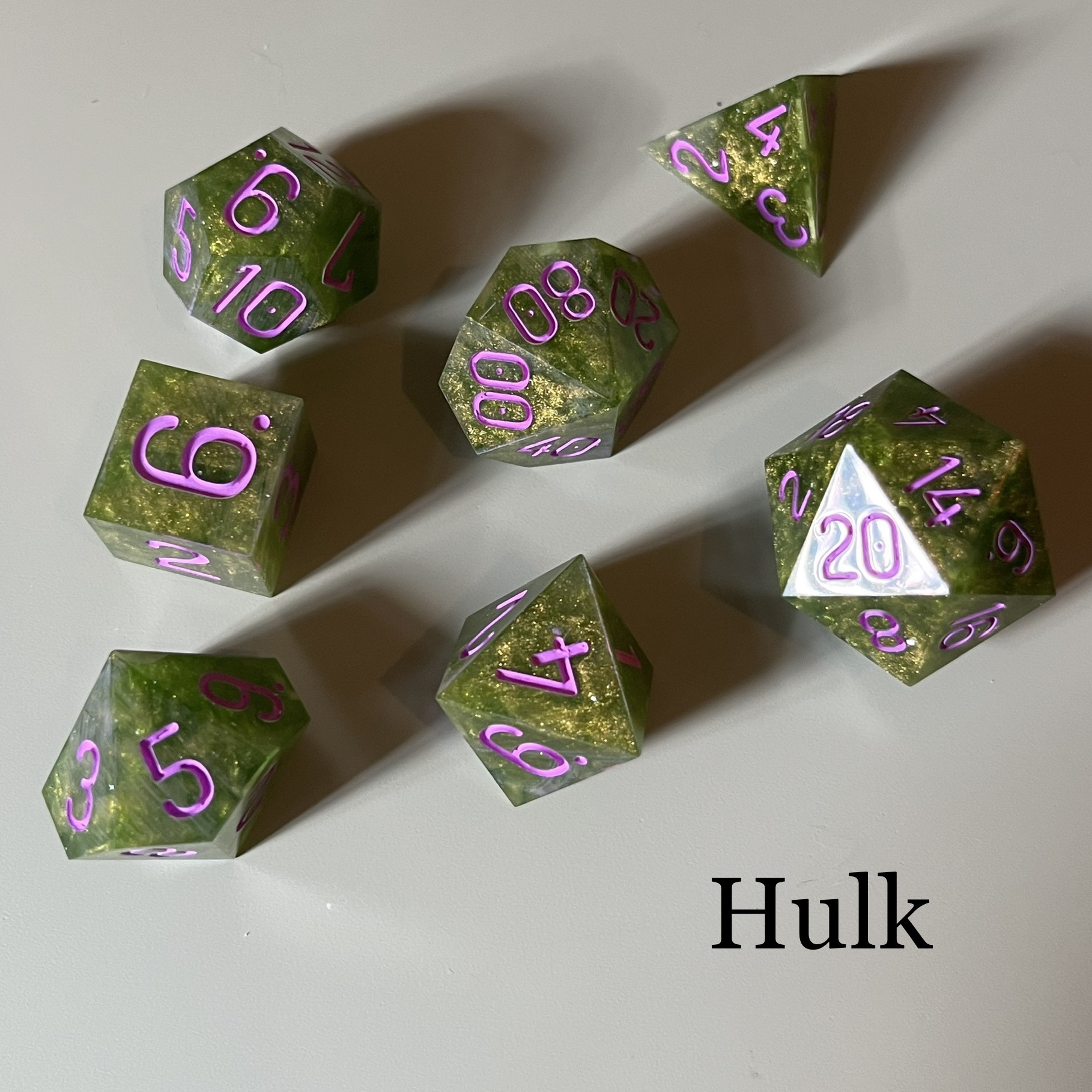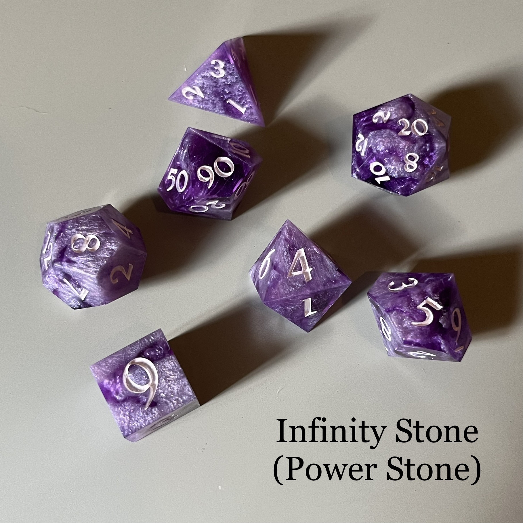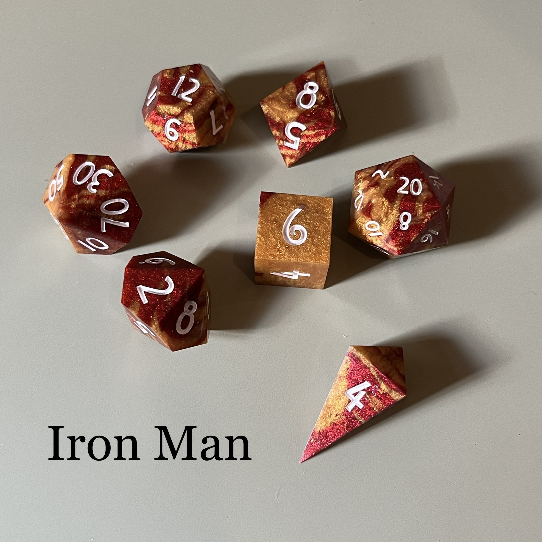 - I am offering a customized set of resin dice with a color scheme inspired by Marvel characters. This is a standard set of 7 polyhedral dice for Dungeons & Dragons – a D4, D6, D8, D%, D10, D12, and D20. The winner can pick from 3 different dice/font designs and a large variety of colors for the resin and number inking.
